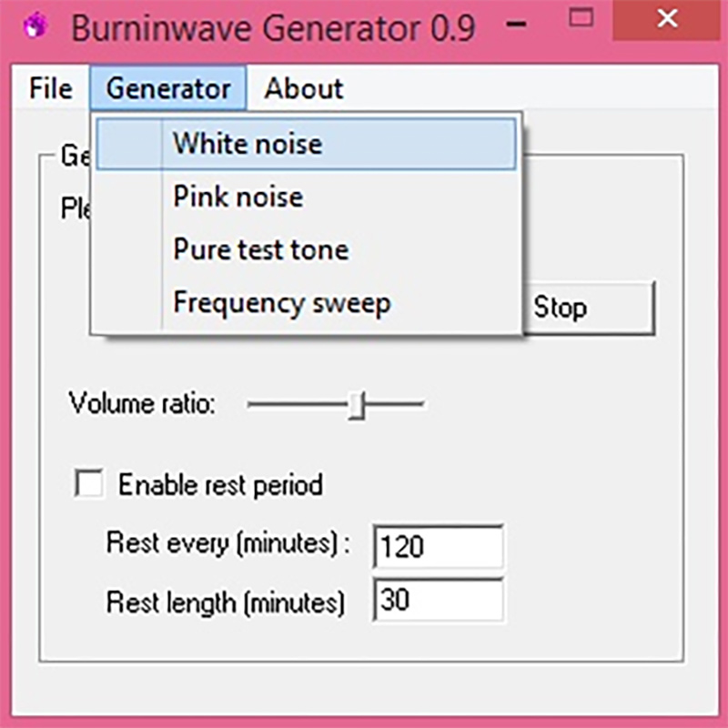- Bấm vào Generator và chọn một trong số các âm thanh sau: White noise, pink noise, pure test tone và frequency sweep. Bạn nên chọn Pink noise để đạt hiệu quả cao nhất và thời gian burn-in ngắn.