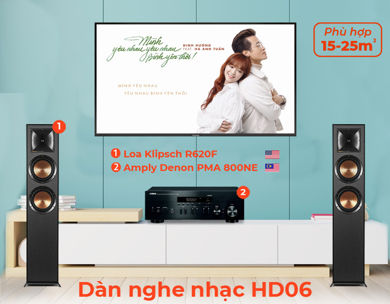 Dàn âm thanh nghe nhạc HD06 là sự kết hợp hoàn hảo giữa Amply Denon PMA 800NE với cặp Loa Klipsch R620F được các kỹ thuật viên ưu tú của HDRadio đưa ra cấu hình thiết kế cho các không gian phòng từ 15 -  25 mét vuông, với khả năng nghe nhạc bolero, nhạc trữ tình vô cùng ấn tượng.