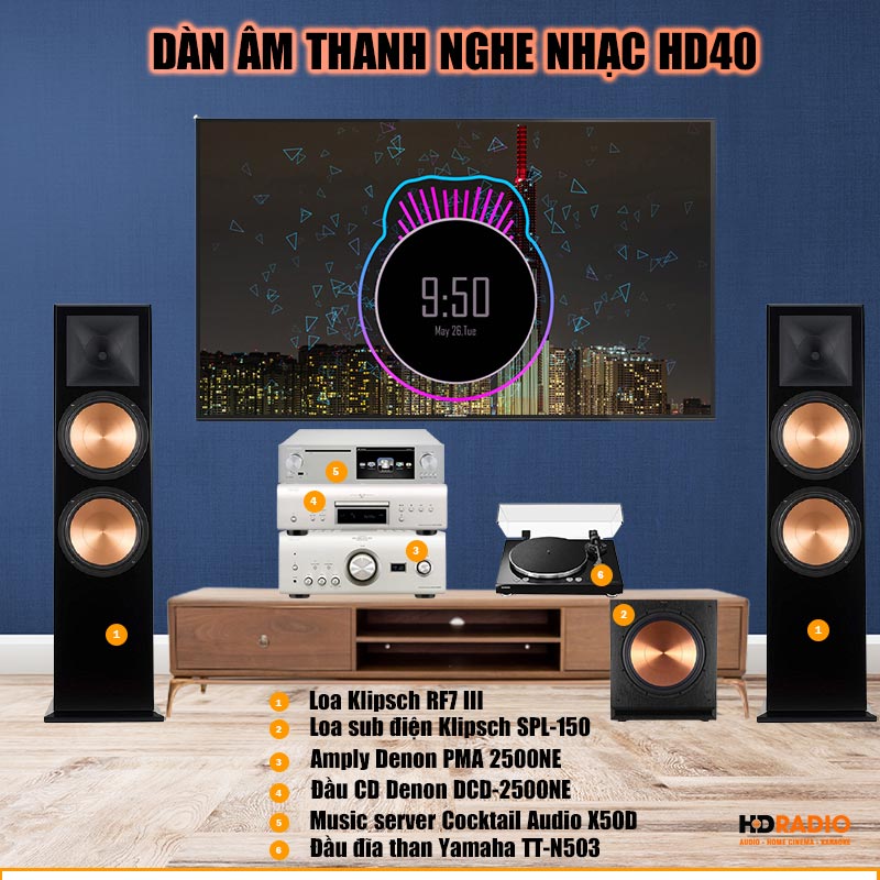 Dàn âm thanh nghe nhạc HD40 đem âm nhạc Hifi ấn tượng đến ngôi nhà của bạn, dàn nghe nhạc với sự kết hợp hoàn hảo tốt nhất giữa các thương hiệu âm thanh nổi tiếng YAMAHA và Klipsch, DENON, Cocktail Audio cho âm thanh nghe nhạc chất lượng, bay bổng  cùng nhiều tính năng tiện ích cao cấp, hiện đại.