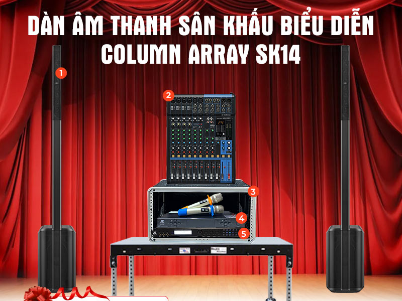 Dàn âm thanh sân khấu biểu diễn Column Array SK14 là hệ thống âm thanh chuyên dụng dành cho các không gian sản khấu biểu diễn có quy mô diện tích trong khoảng từ 50-100m2 được tạo nên bởi sự góp mặt của các thiết bị âm thanh cao cấp đến từ những thương hiệu nổi tiếng JKaudio, Bose, Soundcraft cùng tủ đựng chất lượng cao. Các sản phẩm của dàn âm thanh sân khấu biểu diễn này bao gồm: