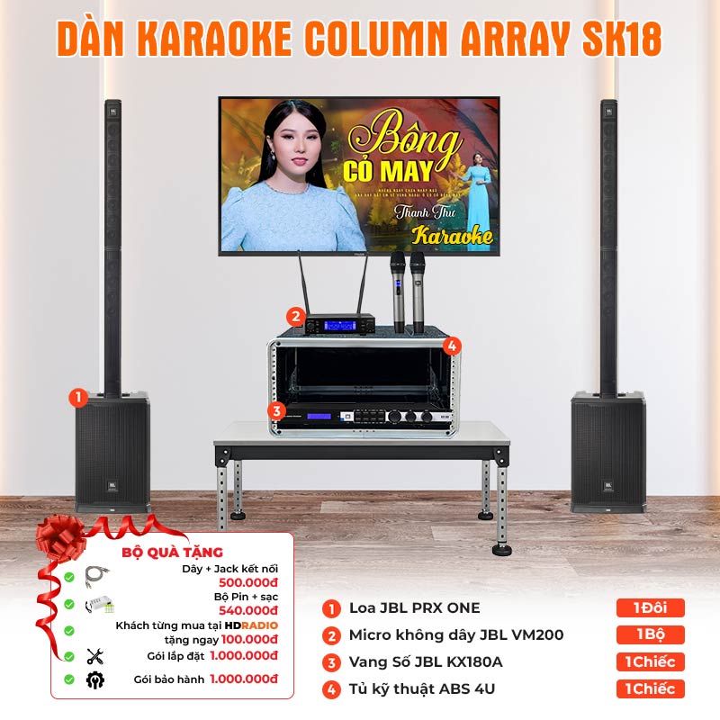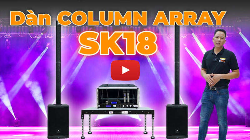 Dàn karaoke Column Array SK18 là hệ thống âm thanh chuyên dụng chất lượng cao có thể đáp ứng hoàn hảo cho các không gian diện tích trong khoảng từ 50-100m2 được tạo nên bởi sự góp mặt của các thiết bị âm thanh cao cấp mang thương hiệu nổi tiếng thế giới JBL và tủ đựng chất lượng. Cụ thể các sản phẩm thuộc hệ thống dàn âm thanh gia đình này bao gồm: