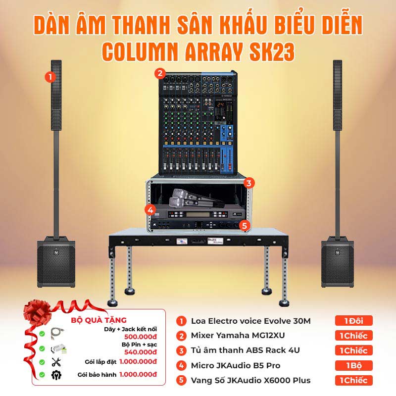 Dàn âm thanh sân khấu biểu diễn Column Array SK23 là hệ thống âm thanh chuyên dụng dành cho các không gian sản khấu biểu diễn có quy mô diện tích trong khoảng từ 50-100m2 được tạo nên bởi sự góp mặt của các thiết bị âm thanh cao cấp đến từ những thương hiệu nổi tiếng Electro-Voice, Soundcraft và JKAudio cùng hộp đựng chất lượng cao. Các sản phẩm của dàn âm thanh sân khấu biểu diễn này bao gồm: