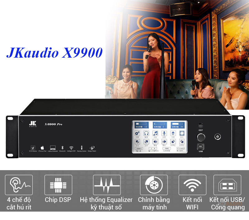 Vang số JKaudio X9900 Pro thuộc dòng mixer karaoke cao cấp chuyên dùng cho hệ thống karaoke chuyên nghiệp. Không bao giờ bị rè tiếng micro kể cả khi đặt micro sát vào miệng và hát thật to. Vang số JKaudio X9900 Pro được trang bị bộ vi xử lý thông minh và hệ thông mạch tín hiệu cao cấp, thêm nữa nó còn sử dụng phần mềm căn chỉnh âm thanh thế hệ mới nhất, được sản xuất bởi tập đoàn Winbond nhà cung cấp giải pháp bán dẫn lớn nhất toàn cầu hiện nay và người dùng có thể tải về miễn phí trên APPSTORE.