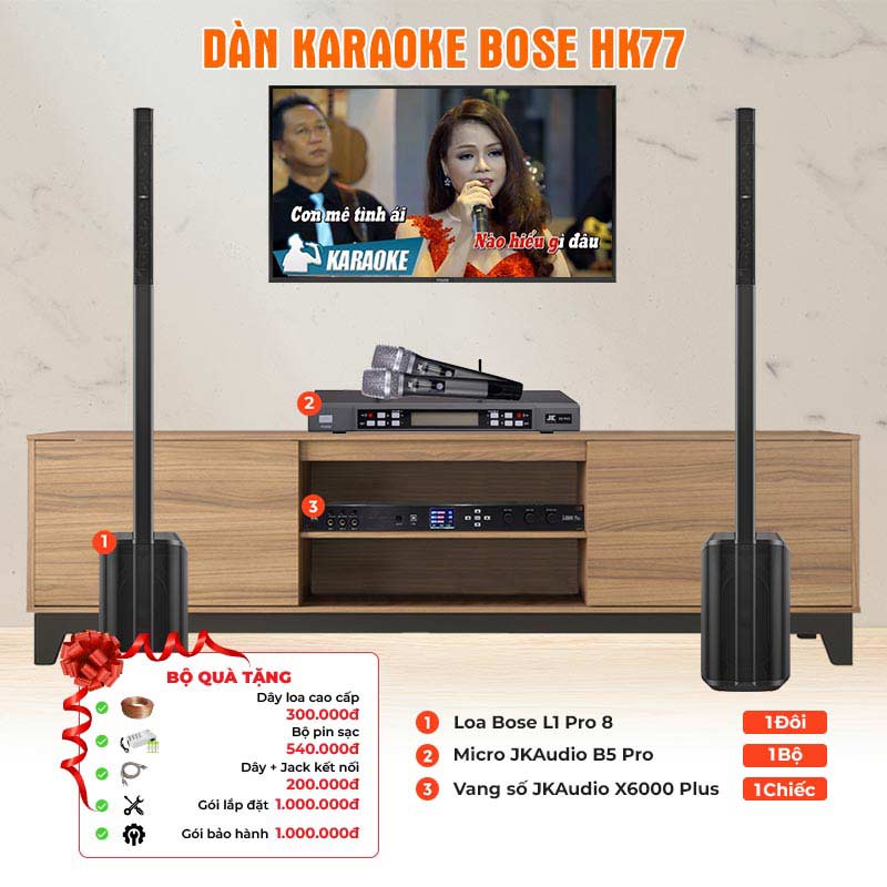 Hệ thống Karaoke Bose HK77 là bản phối ghép hoàn hảo giữa ba thiết bị âm thanh, bao gồm: Loa Bose L1 Pro 8, Vang Số JKaudio X6000 Plus và bộ Micro không dây JKAudio B5 Pro. Có cấu hình âm thanh đơn giản, nhỏ gọn, trong đó mỗi thiết bị đóng những vai trò riêng biệt, tuy nhiên, khi kết hợp với nhau tạo nên một bộ dàn amply karaoke hoàn hảo, khiến người nghe khó cưỡng lại được sự hấp dẫn của chất âm mượt mà trong trẻo.