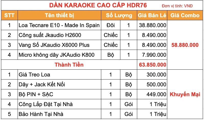 Giá bán lẻ của từng sản phẩm trong dàn Karaoke HDR76 của anh Tuấn