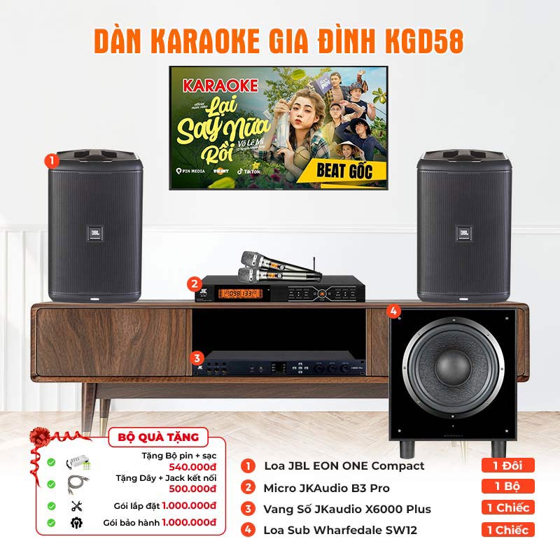 Đánh giá Dàn karaoke gia đình KGD58 (JBL Eon One Compact, JKAudio X6000 Plus, B3 Pro, sub Wharfedale SW12)