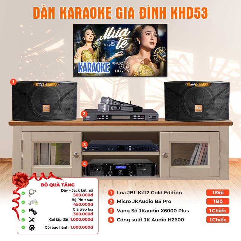 Dàn karaoke gia đình KHD53 (JBL Ki112 Gold Edition, JKAudio H2600, JKaudio X6000 Plus, JKAudio B5 Pro) Dàn karaoke gia đình KHD53 (JBL Ki112 Gold Edition, JKAudio H2600, JKaudio X6000 Plus, JKAudio B5 Pro)
