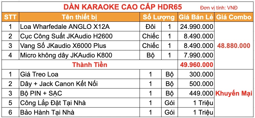 Nếu bạn đang tìm kiếm cho mình một bộ dàn karaoke chuyên nghiệp, ca hát cực hay mà giá cả vẫn ở mức phải chăng thì Bộ Dàn Karaoke cao cấp HDR65 là một sự lựa chọn không thể bỏ qua. Được đánh giá là một trong những hệ thống âm thanh chuyên nghiệp nhất đến từ HDRadio, dàn amply hát karaoke sở hữu cấu hình mạnh mẽ, được phối ghép từ các thiệt bị âm thanh chính hãng đến từ nhiều thương hiệu đình đám trên thế giới như Wharfedale, JKaudio - Mang đến chất lượng âm thanh ấn tượng, trình diễn hoàn hảo, giúp bạn tận hưởng những phút giâ ca hát tại gia trọn vẹn!
