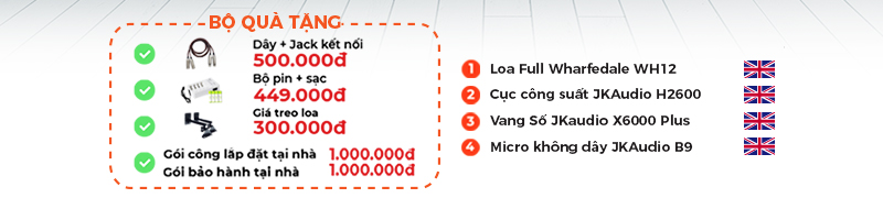 Bộ dàn loa amply karaoke với khả năng chống hú tuyệt đối với sự góp mặt của chiếc vang số JKaudio huyền thoại cùng đôi loa full bass 30 có độ phủ âm rộng và cục đẩy công suất thương hiệu an quốc JKaudio, với bộ mic không dây với nhiều tính năng cao cấp hứa hẹn mang tới âm thanh hoàn hảo.