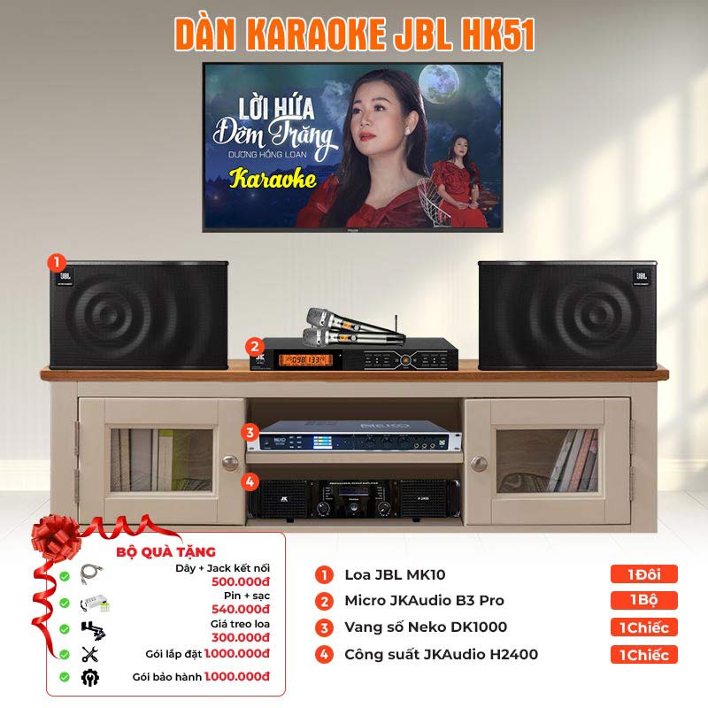 Nhỉnh 25 triệu liệu sắm được dàn karaoke về biếu bố mẹ không? Được bạn nhé. Dàn karaoke JBL HK51 giá chỉ hơn 25 triệu, nghe nhạc, hát hò âm thanh đẹp. Dàn JBL mã HK51 phối ghép 3 mã thiết bị tương tự dàn karaoke HK52. Vang số chỉnh cơ DK1000 tính năng đơn giản do đó cũng dễ sử dụng hơn và giá thành cũng mềm mại hơn Vang số JKAudio X3000 Pro, dàn karaoke cao cấp chắc chắn sẽ đem lại những trải nghiệm âm thanh tuyệt vòi cho gia đình bạn.