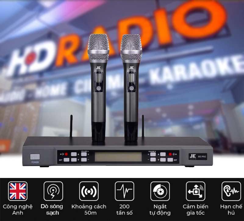 Đây là bộ mic hát không dây của thương hiệu JKaudio nổi tiếng tại Anh, sử dụng tần số UHF phiên bản mới nhất thể hiện sự sang trọng, đẳng cấp đến từ chi tiết của dòng mic thế hệ Pro. Model có cấu tạo bao gồm 1 đầu thu và 2 tay micro không dây, có khả năng tự động dò sóng sạch giúp hạn chế tình trạng nhiễu sóng, dớt sóng cũng như được tích hợp tính năng cảm biến tự ngắt tín hiệu sau 5s không hát giúp tiết kiệm pin.
