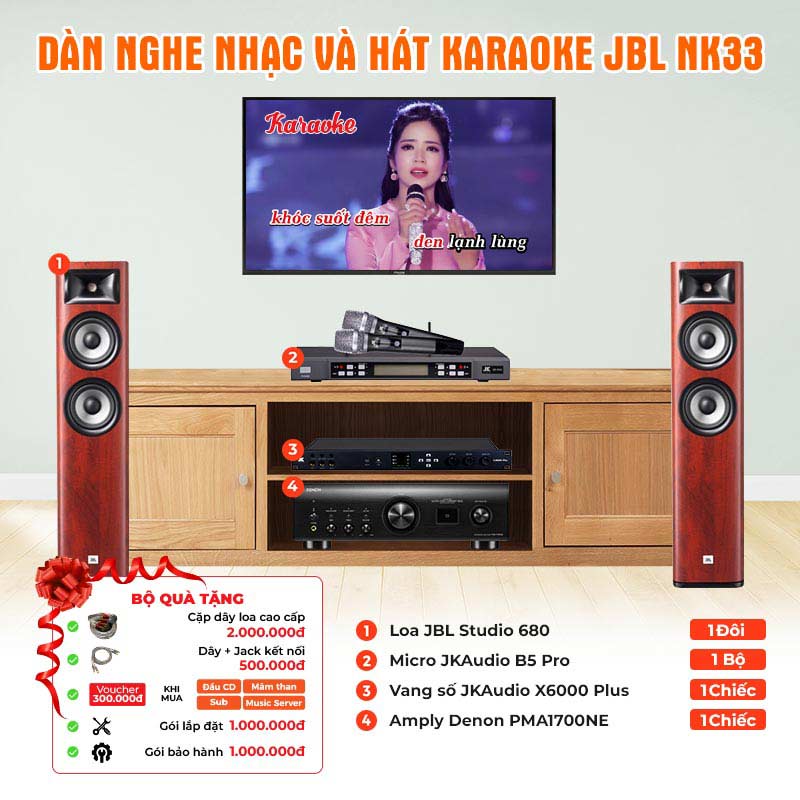 Dàn nghe nhạc và hát karaoke JBL NK33 là sự kết hợp ăn ý giữa 4 thiết bị âm thanh chất lượng, bao gồm: Loa JBL Studio 680, amply Denon PMA1700NE, micro không dây JKAudio B5 Pro, vang số JKAudio X6000 Plus. Tất cả tạo nên một dàn nghe nhạc và hat karaoke hiện đại, giúp bạn thỏa sức nghe nhạc và thể hiện niềm đam mê ca hát của mình một cách dễ dàng.