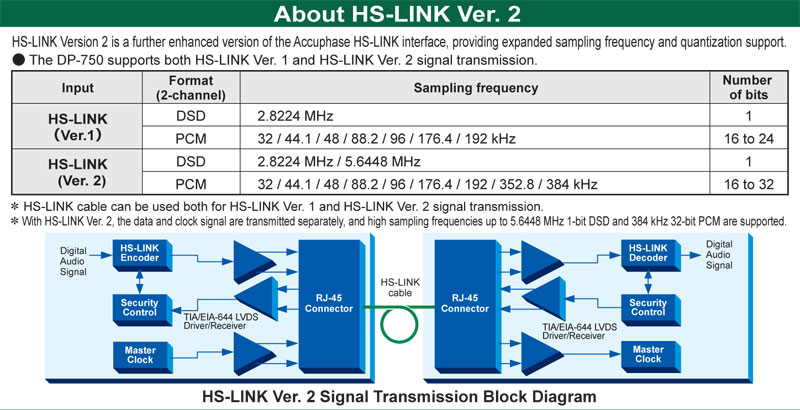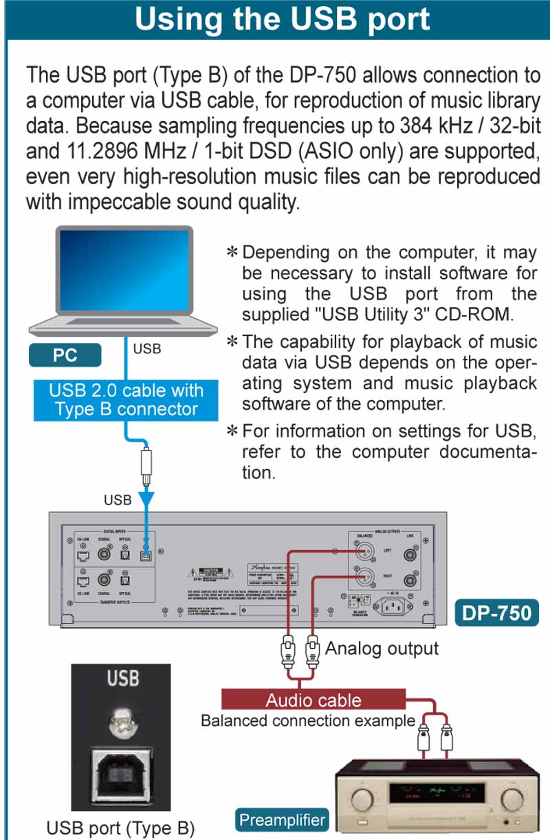 Đầu CD Accuphase DP750 cũng có thể phát CD-R / -RW, DVD-R / -RW / + Đĩa R / + RW. Các định dạng tệp được hỗ trợ bao gồm WAV, FLAC, DSF và DSDIFF. Mảng đầu vào kỹ thuật số bao gồm HS-LINK (Ver. 1 vàVer. 2), HỢP ĐỒNG, QUANG HỌC và USB. Accuphase DP750 có đầu ra Balanced cho phép kết nối phân cực với các thiết bị xử ký âm thanh khác.