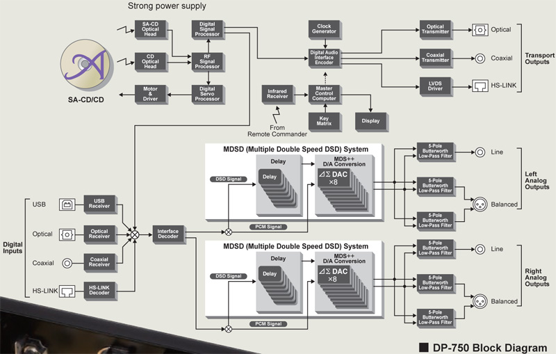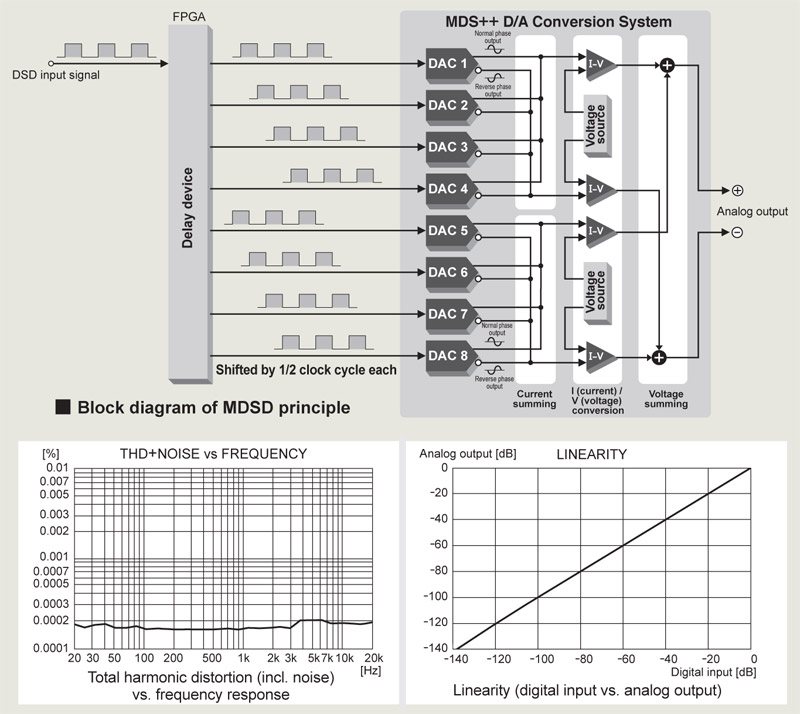 Đầu CD Accuphase DP750 sử dụng nguyên tắc MDSD mới, trong đó tám tín hiệu DSD thay đổi theo thời gian được tạo và cung cấp thẳng đến tám bộ chuyển đổi D / A loại MDS ++ được sắp xếp song song cấu hình. Toàn bộ mạch do đó hoạt động trong một bộ lọc trung bình với pha tuyến tính hoàn hảo. Cách tiếp cận mang tính cách mạng này cho phéploại bỏ triệt để các thành phần tiếng ồn mà không cần phải chuyển đổi tín hiệu DSD thành dạng PCM.