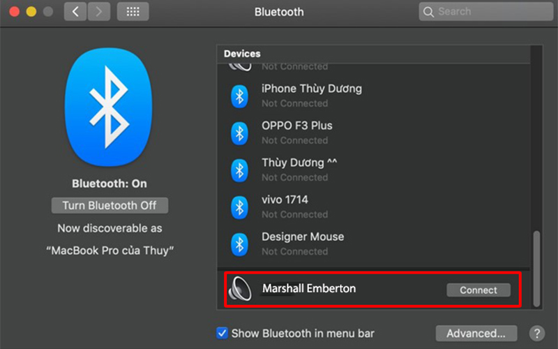 Tìm đúng bluetooth của chiếc loa bluetooth marshall của bạn, sau đó chọn để ghép nối không dây 2 thiết bị bằng cách nhấn nút "Connect"