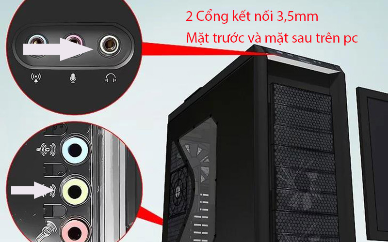 Cắm giắc cắm 3,5mm vào cổng có biểu tượng tai nghe nhỏ hoặc line out (màu vàng mắt sau pc).