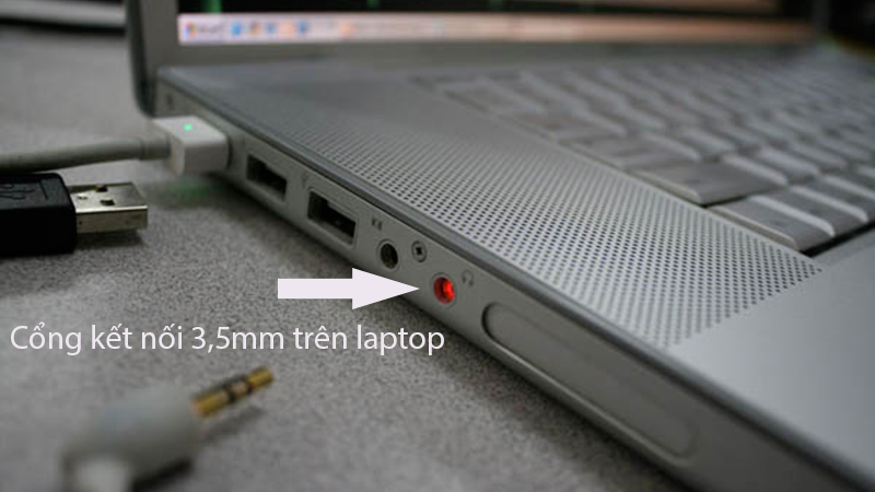 Bước 1: Cắm một đầu cáp 3,5mm vào cổng có biểu tượng tai nghe nhỏ hoặc line out của máy tính để bàn PC, hoặc laptop