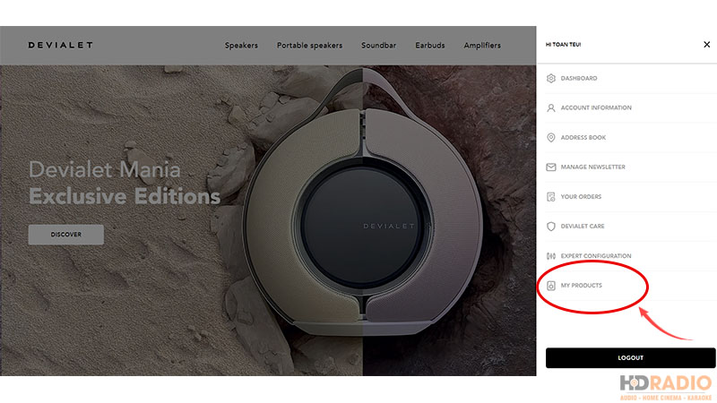 4. Ngay khi tạo tài khoản thành công, website sẽ tự động đăng nhập với tài khoản mới bạn vừa tạo (hãy lưu mật khẩu để lần sau đăng nhập sau bạn không cần nhập lại). Sau khi thành công, hãy click vào biểu tượng "người dùng" trước đó và bảng giao diện nhỏ sẽ hiện ra. Hãy click vào "My Product" để khai báo sản phẩm loa Devialet của bạn.