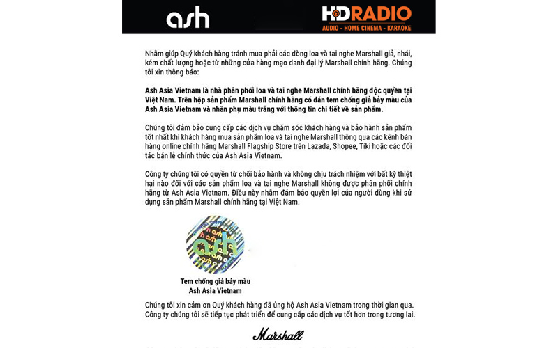 Để chắc chắn mua được những mẫu loa marshall chính hãng ngoài việc kiểm tra các dấu hiệu hãng ASH trên bao bì sản phẩm như: tem ASH 7 màu, tem xuất xứ ASH các bạn nên đến các địa chỉ bán loa marshall chính hãng uy tín được ASH chỉ định như HDRadio (Hotline 1800.0042 - miễn phí cước) để mua sản phẩm