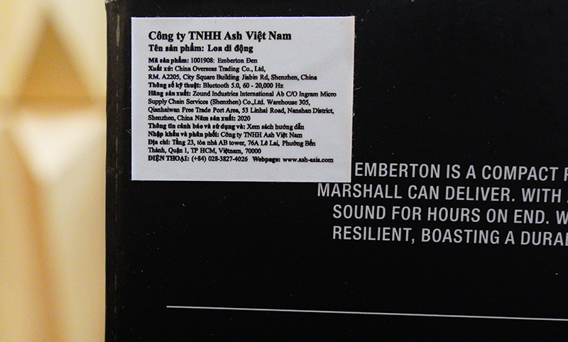 - Phân biệt loa marshall emberton chính hãng ASH và loa marshall emberton fake qua hộp loa bên ngoài: