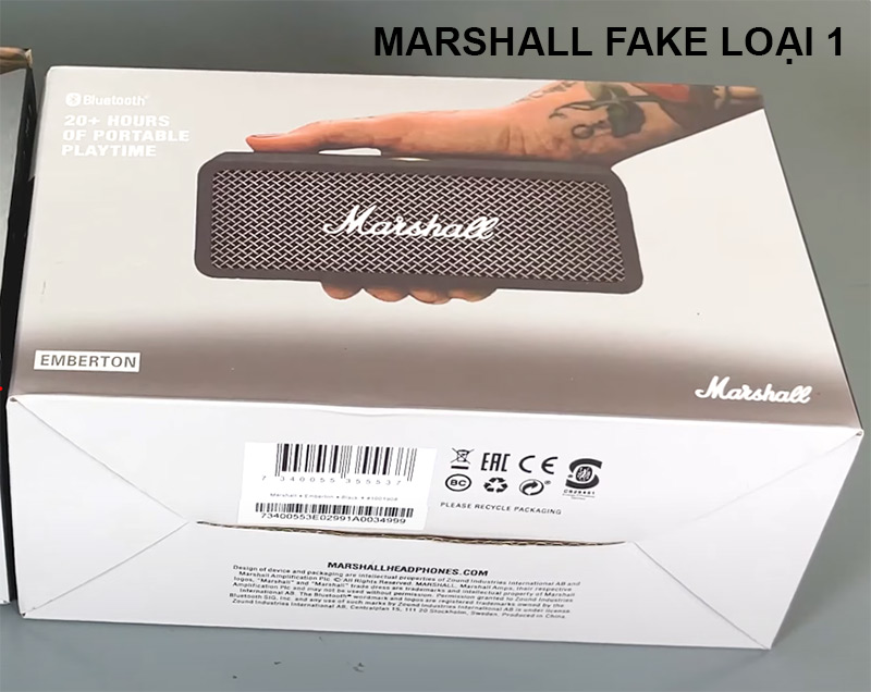 Hộp loa marshall emberton fake KHÔNG có tem ASH 7 màu, không có tem phụ của hãng ASH, màu sắc hộp nhòe, ám màu nâu bởi chất lượng mực không tốt.