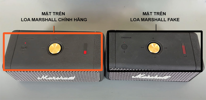 Loa marshall emberton fake có phần biểu tượng được in sâu rõ do sử dụng các máy in laze chìm thông dụng, đặc biệt phần led pin không đỏ đều tạo có cảm giác nhấp nháy rất hại mắt. Nút đa hướng phía trên được thiết kế dựa trên chất liệu mạ đồng rẻ tiền nên tạo cảm giác bóng cao nhìn khá là giả.