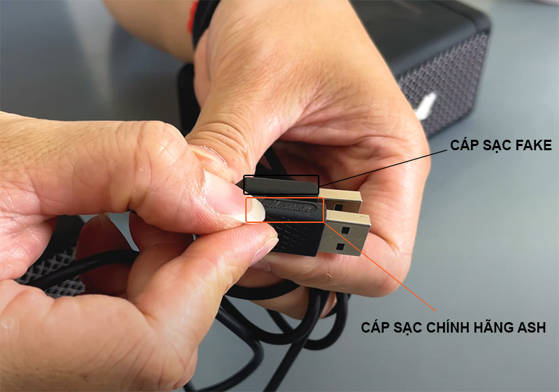 - Phân biệt loa marshall emberton chính hãng ASH và loa marshall emberton fake thông qua cáp sạc: