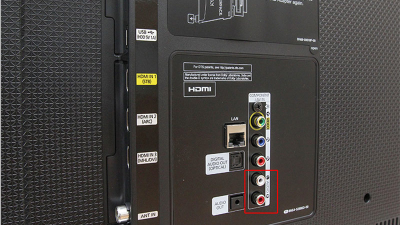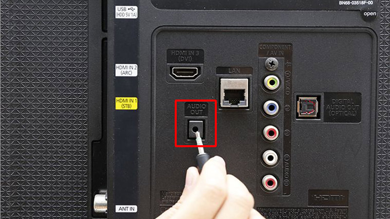 Bước 2: Cắm đầu dây 3,5 còn lại vào cổng có ký hiệu AUDIO OUT trên Tivi