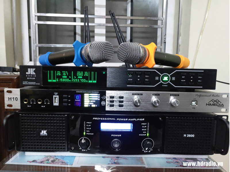 Lắp dàn karaoke anh Quyền ở Long Biên, Hà Nội (Loa Wharfedale ANGLO X12A, Cục công suất JKAudio H2600, Vang số Himedia H10, Micro không dây JKAudio B3 Plus)
