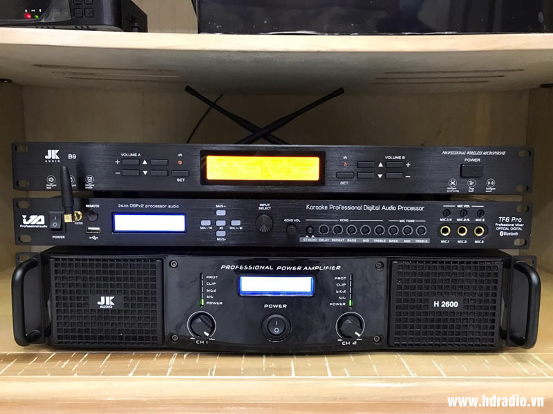 Lắp dàn loa full anh Sơn quận Hoàng Mai, Hà Nội (Loa Wharfedale WH10 NEO, Vang cơ JA TF6 Pro, Cục công suất JKAudio H2600, Micro không dây JKAudio B9)