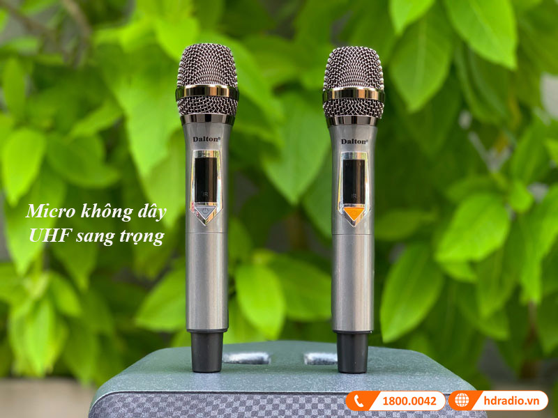 Với loa kéo Dalton TS-12G350N, việc hát karaoke trở nên dễ dàng và hoàn hảo hơn bao giờ hết, khi loa đi kèm là 02 micro không dây UHF. Thân micro được thiết kế bằng chất liệu kim loại cứng cáp, sơn tĩnh điện màu đen xám giúp tạo nét thẩm mỹ và sự sang trọng cho micro. Việc sử dụng tần số UHF giúp cho việc kết nối và truyền tín hiệu micro được chuẩn và mạnh mẽ hơn. Đặc biệt micro không dây có khả năng chỉnh được tần số kết nối. Việc này giúp cho loa tránh trường hợp trùng lặp tần số micro với các loa khác ở gần.