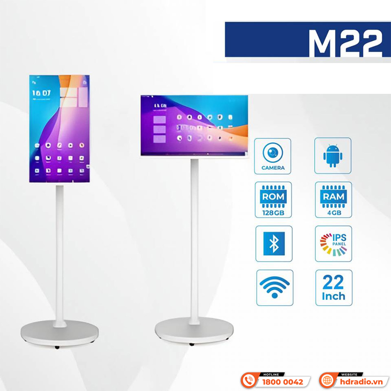 Điểm nổi bật ở thiết kế là chân đế tích hợp 5 bánh xe giúp dễ dàng di chuyển đến bất kỳ vị trí nào trong nhà. Đồng thời, khả năng xoay ngang – dọc 90°, cùng góc nghiêng ±20° cho phép người dùng tùy chỉnh góc nhìn một cách linh hoạt – một ưu điểm nổi bật mà các thiết bị tivi hay tablet thông thường khó sánh được. M22 còn được trang bị pin sạc tích hợp dung lượng 8000mAh, mang lại thời lượng sử dụng lên đến 6 giờ liên tục – hoàn toàn không cần dây cáp rườm rà khi sử dụng di động.