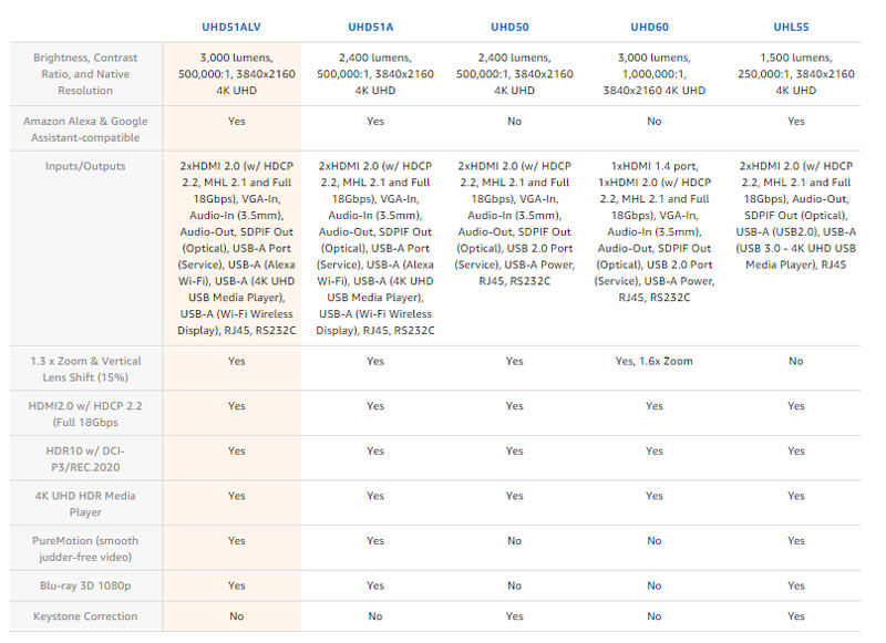 Bảng so sánh máy chiếu 4K Optoma UHD51A với một số mẫu máy chiếu khác