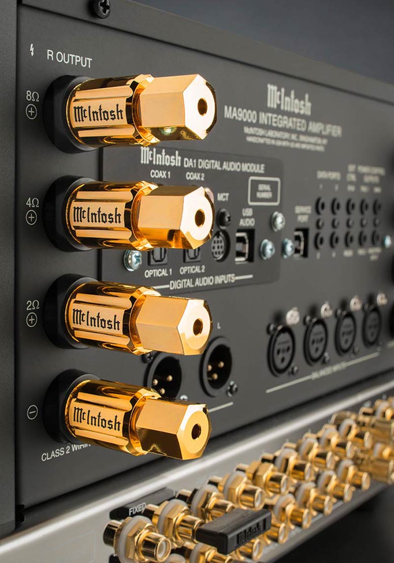 Amply McIntosh có các cọc loa mạ vàng chất lượng công nghệ Solid Cinch ™ giúp gắn chắc chắn dây loa tvới amply, tránh bị lỏng và có thể gây chập điện; các cột liên kết cũng được mạ vàng để chống ăn mòn và đảm bảo tín hiệu chất lượng được gửi qua cáp loa đến loa Hi-End của bạn.