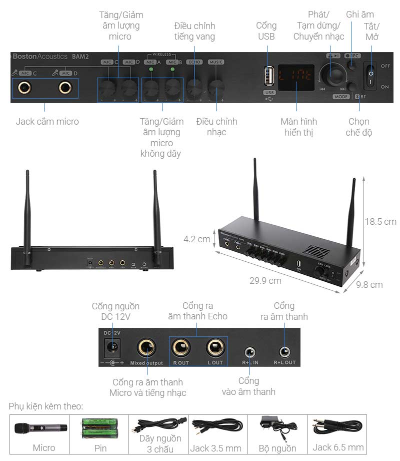 Boston Acoustics BAM2 là mẫu micro không dây tích hợp Echo sở hữu hệ mạch điện tử cao cấp đến từ thương hiệu nổi tiếng Boston Acoustics. Mẫu micro này không chỉ thu hút người dùng với vẻ bề ngoài sang trọng, tinh tế mà còn gây ấn tượng hơn bởi chất lượng truyền tải giọng hát trung thực, nhẹ nhàng, méo tiếng cực thấp. Micro Boston Acoustics BAM2 có thể sử dụng linh hoạt trong nhiều môi trường khác nhau như: phòng giải trí gia đình, phòng karaoke kinh doanh, phòng họp, hội trường, sân khấu nhỏ…
