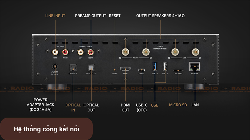 - Kết nối: Wi-fi, Ethernet, Bluetooth 4.0, 1x đầu vào analog, 1x đầu vào quang kỹ thuật số, 3x cổng USB, 1x đầu đọc thẻ SD, 1x đầu ra analog, 1x đầu ra quang kỹ thuật số, đầu ra 1x HDMI, đầu ra tai nghe 1x