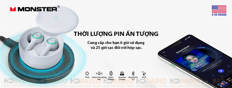 Bạn có thể chơi nhạc trên tai nghe Monster Clarity 102 AirLinks trong 6 giờ liên tục (ở mức âm lượng 70%) và 25 giờ sạc đối với hộp sạc. Bên cạnh đó, nó còn sở hữu tính năng sạc không dây cực kỳ tiện lợi, chỉ cần đặt trên đế sạc là người dùng có thể sạc nhanh thiết bị mọi lúc mọi nơi.