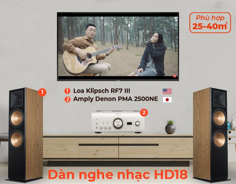 Dàn nghe nhạc Klipsch, Denon HD18 là một trong những bộ dàn nghe nhạc cao cấp bán chạy nhất tại HDRadio, phối hợp ăn ý giữa Amply Denon PMA 2500NE (Xuất Xứ Nhật Bản) với cặp Loa Klipsch RF7 III, cho khả năng thể hiện hoàn hảo tất cả các thể loại nhạc từ trữ tình đến nhạc bolero hay nhạc vàng .trong khoảng không gian từ 25 - 40 mét vuông.